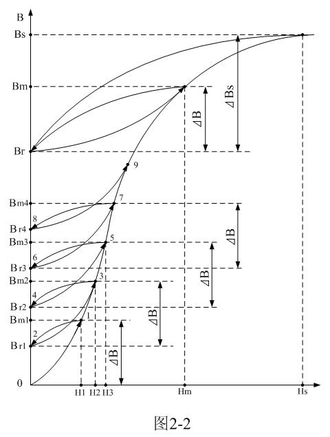 經(jīng)過n個(gè)直流脈沖電壓之后,變壓器鐵芯中的最大磁通密度Bm和剩余磁通密度Br才能基本穩(wěn)定在某個(gè)數(shù)值之上,即:脈沖序列的作用達(dá)到穩(wěn)定狀態(tài)后,磁化過程將沿原始曲線上某一固定局部磁滯回線n點(diǎn)重復(fù);這時(shí)剩余磁通密度為Br n(Br n= Br),磁通密度變化無論磁場(chǎng)強(qiáng)度增長(zhǎng)或降低,其ΔB值基本不變。