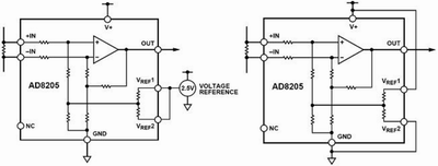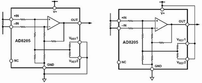 雙極性輸出時AD8205可以測量流過采樣電阻上的雙向電流,這時,輸出可以偏置到輸出范圍內的任意位置。當被檢測的正反兩個方向上的電流為等幅時,其輸出必須偏置到滿量程輸出的中間位置。當雙向電流幅值不對稱時,輸出偏置可以對應地偏離半量程位置。它的兩個參考輸入VREF1和VREF2分別連接一個內部電阻RREF后接到同一個內部偏置節(jié)點,這兩個參考輸入端的操作方式完全相同。在兩個參考電壓輸入端接入對應的電壓,即可完成對輸出的偏置。在雙極性輸出方式下,一般有以下兩種連接方式。