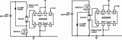 如圖4(b)所示連接,PWM開關和采樣電阻都位于電壓高側。當PWM開關打開時,負載電源將被移除,但仍然可以提供和監(jiān)測續(xù)流電流,以實現電流控制診斷。在工作過程中,大部分時間電源都和負載隔離,這樣可將負載對地之間的差分電壓所引起的不良影響減到最小。當PWM開關閉合時,電源電壓將連接到負載,這時共模電壓將增加到電源電壓。而PWM開關打開時,電壓將反轉并經過感性負載,由于續(xù)流二極管的作用,使得采樣電阻上的共模電壓保持為一個低于地的二極管的導通壓降。
