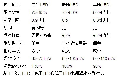 低壓LED驅(qū)動電源是從開光電源原邊反饋電路移植過來的產(chǎn)物,設(shè)計電路復(fù)雜,恒流精度誤差較大。小功率開關(guān)電源驅(qū)動方式驅(qū)動效率充其量設(shè)計到80%,LED應(yīng)用開始要求功率因數(shù),小功率電源并不具備。器件壽命受到限制,內(nèi)置電源體積也受限,市場機會因此受到局限。 高壓LED是因上述問題而誕生的產(chǎn)物,集交流LED和低壓LED之優(yōu)點,驅(qū)動效率及恒流精度大大提升,各項參數(shù)均優(yōu)秀,性能價格比高。