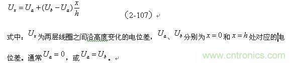 設(shè)圓柱形兩層線圈之間的距離為d,高度為h,平均周長(zhǎng)為g 。假定兩層線圈之間沿高度的電位差為線性變化,即: