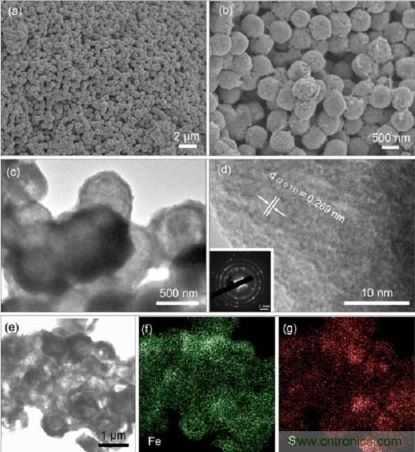 顯微鏡(SEM)圖像;(c,d)Fe1-xS納米材料的投射電子顯微鏡(TEM)圖像,插圖:電子衍射圖像;(e-g)Fe1-xS納米材料各元素的EDX面掃描圖。