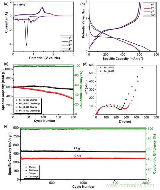 Fe1-xS納米材料的(a)CV圖;(b)充放電曲線圖;(c)循環(huán)穩(wěn)定曲線;(d)交流阻抗圖;(e)不同充放電倍率下循環(huán)穩(wěn)定性曲線。