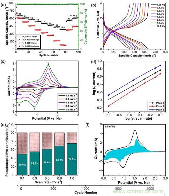 Fe1-xS納米材料的(a)倍率性能曲線;(b)相應(yīng)倍率下充放電曲線;(c)不同掃速下的CV曲線;(d)相應(yīng)氧化還原峰下的log i vs. log v曲線;(e)不同掃速下的贗電容貢獻(xiàn);(f)掃速為0.5 mV s-1時(shí),CV曲線及相應(yīng)贗電容所占比例。