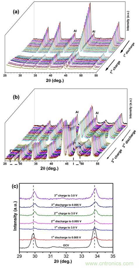 (a)第一周充放電原位XRD圖;(b)第三周充放電原位XRD圖;(c)一定充放電電位下XRD圖。
