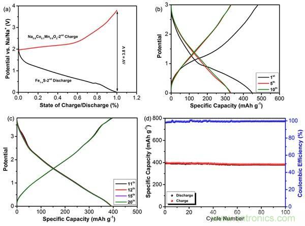 (a)Na0.6Co0.1Mn0.9O2正極和Fe1-xS負(fù)極充放電曲線對(duì)比;Na0.6Co0.1Mn0.9O2/Fe1-xS全電池在電流密度20 mA g-1時(shí)的電化學(xué)性能(b,c)充放電曲線;(d)循環(huán)穩(wěn)定性曲線。