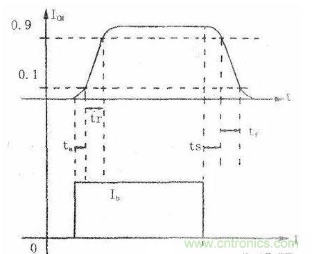 為了研究三極管開(kāi)/關(guān)此瞬間過(guò)程,首先對(duì)開(kāi)/關(guān)的相對(duì)值作一規(guī)定,即當(dāng)集電極電流達(dá)到其最大飽和電流90%時(shí),認(rèn)定它已接通,而集電極電流下降為I。的10%時(shí),認(rèn)為它已經(jīng)斷開(kāi)。按此標(biāo)準(zhǔn)計(jì)量,三極管開(kāi)/關(guān)過(guò)程所需時(shí)間作為衡量三極管的開(kāi)關(guān)特性的比較標(biāo)準(zhǔn)。
