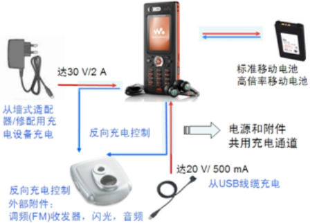 我們把普通墻式適配器或USB充電適配器到移動設(shè)備電池的通道稱為直接充電通道,而把移動設(shè)備電池到外部附件(如調(diào)頻收發(fā)器、負載揚聲器和閃光模塊)的通道稱為反向供電/充電通道(參見圖1移動設(shè)備的直接充電通道和反向供電/充電通道示意圖)。