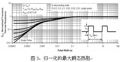 由圖3最下面一條曲線(xiàn)(單脈沖)可知,對(duì)于單脈沖來(lái)說(shuō),要想獲得0.015的熱阻系數(shù),其脈沖寬度不能大于20us。