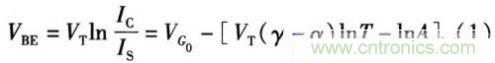 式中VG為帶隙電壓,γ和α為器件參數(shù),A代表了那些方程推到過程中與溫度無關(guān)的常量。因為Vt=kt/q,可以得到VBE隨溫度上升是降低的。其關(guān)于溫度變化的方程為