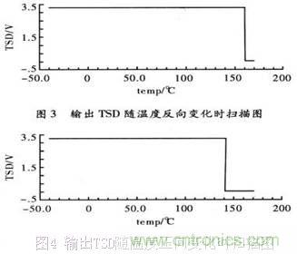 按照以上設(shè)計的電路。用Cadence Specture對其進(jìn)行仿真,器件的模型參數(shù)采用0.35μm CMOS工藝。圖2為過溫保護(hù)電路的輸出控制信號TSD,隨溫度上升和下降的曲線。電源電壓取3.3 V。從仿真結(jié)果可以看出,該電路實現(xiàn)了良好的“溫度遲滯”特性。遲滯功能有效的避免了芯片出現(xiàn)熱振蕩問題。關(guān)斷溫度TH160°和恢復(fù)溫度TL140°。