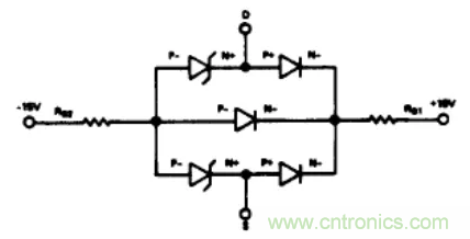 圖1是一個(gè)典型CMOS輸出開關(guān)單元的電路圖及截面圖。從不同單元和區(qū)域之間的連接關(guān)系中,我們可以畫出一個(gè)等效二極管電路圖(圖2)。如果在S端或D端的模擬輸人電壓超過電源電壓。