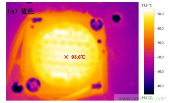 因此為有效研究COB光源表面的熱分布,建議選用紅外熱成像儀進(jìn)行非接觸測量。由于COB光源發(fā)光面的溫度高于普通SMD器件,因此在封裝工藝和材料選擇上較SMD器件嚴(yán)苛,尤其對熒光粉和硅膠的耐溫性提出了更高的要求。