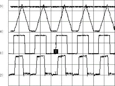 圖1中,V8為振蕩電路產(chǎn)生的振蕩脈沖,其占空比為50%,由該脈沖決定開關(guān)器件的工作頻率。V1為原邊電流采樣電阻上的壓降,V2為輸出電壓的反饋值,V3是用于驅(qū)動(dòng)開關(guān)管的信號(hào)。V2經(jīng)過PI調(diào)節(jié)器進(jìn)行誤差放大后輸入到比較器的反向端,與輸入到比較器同向端的經(jīng)過誤差放大后的V1值進(jìn)行比較,從而決定V3的脈寬大小。邏輯電路產(chǎn)生的信號(hào)經(jīng)過輸出級(jí)后用來(lái)驅(qū)動(dòng)MOSFET的開通和關(guān)斷,該信號(hào)(V3)的占空比與輸出電壓的反饋值V2成反比,實(shí)現(xiàn)電壓反饋式的控制環(huán),同時(shí),該信號(hào)的占空比還與輸入的直流電壓值成反比,以實(shí)現(xiàn)電路的前饋控制。V3信號(hào)由經(jīng)過放大后的原邊電流的采樣電阻上的電壓值和經(jīng)過PI調(diào)節(jié)器的輸出電壓的反饋值共同來(lái)控制。圖2為各個(gè)反饋信號(hào)的誤差放大值、振蕩脈沖V8以及MOSFET的驅(qū)動(dòng)信號(hào)V3波形。圖2中1)為振蕩脈沖V8的波形,2)為驅(qū)動(dòng)信號(hào)V3的波形,3)、4)為電壓反饋和電流反饋值經(jīng)過誤差放大后的波形(V2和V1的波形)。