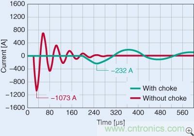 串聯一個扼流圈可有效限制電流峰。di/dt比率也將降至雙向晶閘管可承受而不被損壞的值。如圖2所示,80 μH的電感可將第一個峰值電流降至250 A(綠線)以下、持續(xù)110 μs,使電流保持在安全運行范圍。