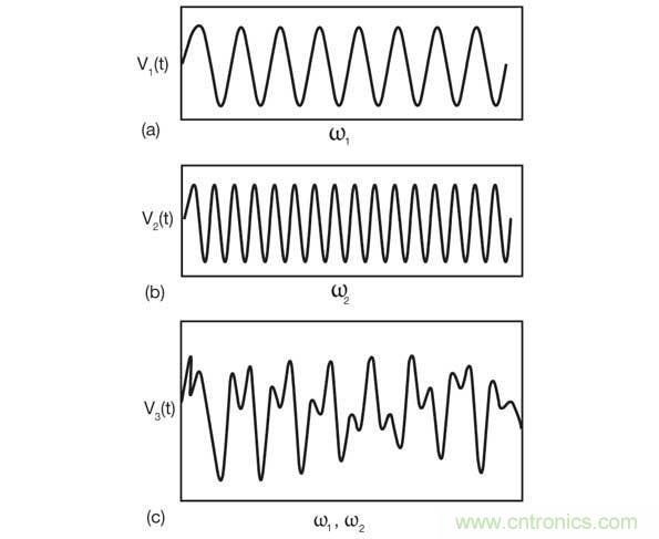 帶高階(<2)諧振器的振蕩器,可以實(shí)現(xiàn)多個(gè)穩(wěn)定的振蕩模式,并產(chǎn)生多個(gè)諧振頻率。借助合適的非線性有源電路拓?fù)浜捅匾闹C振器元件值,更高階振蕩器可以提供多于一個(gè)的諧振頻率。例如,具有四階諧振器的可調(diào)諧振蕩器,可以單獨(dú)或同時(shí)產(chǎn)生兩個(gè)截然不同的頻率ω1和ω2(圖6)。這種振蕩器可以通過在振蕩器晶體管(比如雙極晶體管)基極綜合兩個(gè)不同值電感組裝而成,從而創(chuàng)造同時(shí)持續(xù)振蕩所需的條件。