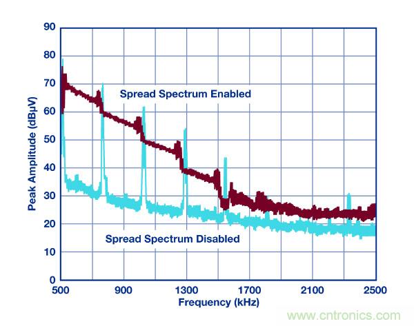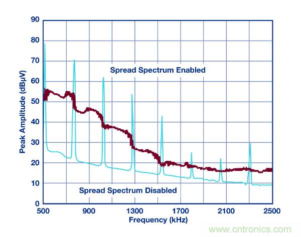 圖 2.擴頻調(diào)制在更寬的時鐘頻帶內(nèi)產(chǎn)生更低的峰值能量。
