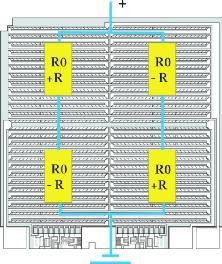 現(xiàn)代傳感器系統(tǒng)主要由兩個(gè)元件組成 —基本傳感器和信號處理專用集成電路 (ASIC)(圖 1)?,F(xiàn)已證明,后來由 Lord Klevin 于 1857 年發(fā)現(xiàn)的各向異性磁阻效應(yīng)特別適用于檢測磁場。首先考慮通常具有多種磁疇結(jié)構(gòu)的鐵磁性材料。這些稱之為韋斯磁疇的結(jié)構(gòu),其內(nèi)部磁化的方向彼此不同。如果將這種材料平鋪為一薄層,那么磁化矢量處于材料層平面方向。另外,可較精確地假設(shè)只存在一個(gè)磁疇。當(dāng)這種元件暴露于外部磁場中時(shí),后者會(huì)改變內(nèi)部磁化矢量的方向。如果同時(shí)一股電流通過該元件,就會(huì)產(chǎn)生電阻(圖 2),這取決于電流和磁化之間的角度。當(dāng)電流和磁化方向彼此成直角時(shí),電阻最小,當(dāng)二者平行時(shí),電阻最大。電阻變化的大小取決于材料。鐵磁性材料的性質(zhì)也決定對溫度的依賴性。電阻最大變化為 2.2% 并且對溫度變化反應(yīng)良好的最佳合金是 81% 的鎳和 19% 的鐵組成的合金。恩智浦所有傳感器系統(tǒng)中的基本傳感器都采用這種強(qiáng)磁鐵鎳合金。在惠斯登電橋電路中單獨(dú)配置幾個(gè) AMR 電阻,以增強(qiáng)輸出信號并改善溫度反應(yīng)特性。此電路也可在制造過程中進(jìn)行微調(diào)。圖 3 顯示如何在裸片上配置 AMR 元件。