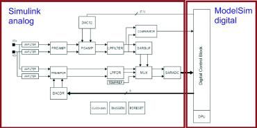確定磁場之后是傳感器系統(tǒng)仿真。AMR 元件的電阻變化是各向異性磁阻效應(yīng)的直接結(jié)果。這樣,磁場仿真的結(jié)果會(huì)導(dǎo)致代表信號處理中輸入信號的電阻發(fā)生變化。對模擬前端進(jìn)行建模可采用 Simulink。這種行為模型是概念設(shè)計(jì)的產(chǎn)物,標(biāo)志著產(chǎn)品開發(fā)的起點(diǎn)。每個(gè) Simulink 塊對應(yīng)一個(gè)模擬信號處理組件,例如放大器或過濾器。但是,尚未考慮模擬組件的控制部分,這由數(shù)字系統(tǒng)實(shí)現(xiàn)。HDL 設(shè)計(jì)則仿真通過數(shù)字方法實(shí)現(xiàn)的功能,而且在完成產(chǎn)品開發(fā)之后就會(huì)最終成形。因此,整體系統(tǒng)仿真是 Simulink 對模擬組件的行為模型以及 ModelSim 對 HDL 設(shè)計(jì)的共同仿真(圖8)??赏ㄟ^仿真從概念階段順利過渡到 HDL 設(shè)計(jì)及后續(xù)階段。在共同仿真中,可用 ModelSim 中部署的 Verilog 代碼逐漸代替 Simulink 參考模型,從而可逐項(xiàng)驗(yàn)證 HDL 設(shè)計(jì)。可持續(xù)進(jìn)行此過程,直到在 Verilog 中實(shí)現(xiàn)整個(gè)數(shù)字部件,而模擬系統(tǒng)部件仍保持為 Simulink 模型。此工具組合也已證明對 IC 評估同樣有用。自始至終使用這種工具可以更容易理解 IC 行為,并可創(chuàng)建用來分析和解釋任何錯(cuò)誤的框架。這些工具的主要好處在于,能夠更快速、更準(zhǔn)確地答復(fù)客戶的查詢,以及更好地了解與環(huán)境條件相關(guān)的傳感器功能。