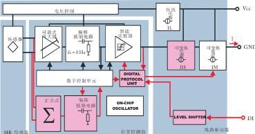 為消除此噪聲對輸出信號的影響,另一封裝中裝入了信號處理專用集成電路(ASIC)。后者也包含一個(gè)線路驅(qū)動(dòng)器,以便為信號處理和高電壓接口提供電源電壓(圖 1)。圖 4 所示為信號處理架構(gòu)。用于故障排除的中心元件為包括調(diào)式放大器、偏移抵消電路和智能比較器。根據(jù)傳感器和編碼器輪之間的距離,可調(diào)式放大器可以與信號級匹配。對于偏移抵消電路,有一種控制系統(tǒng)(與高通濾波器不同)可消除偏移,同時(shí)將系統(tǒng)頻率保持為 0?Hz。否則,就不可能檢測到停止不動(dòng)的編碼器輪。智能比較器的臨界值是可變的,并且可設(shè)置,使磁滯處于信號振幅的 20% 和 45% 之間。這可確保充分抑制噪聲,而且振幅突降達(dá) 50% 也不會(huì)影響系統(tǒng)的正常運(yùn)轉(zhuǎn)。模擬前端的個(gè)別組件控制則通過數(shù)字接口實(shí)現(xiàn)。所述系統(tǒng)均利用仿真技術(shù)開發(fā)和驗(yàn)證。下文將概略介紹系統(tǒng)開發(fā),同時(shí)闡述如何使用模型來改進(jìn)設(shè)計(jì)。